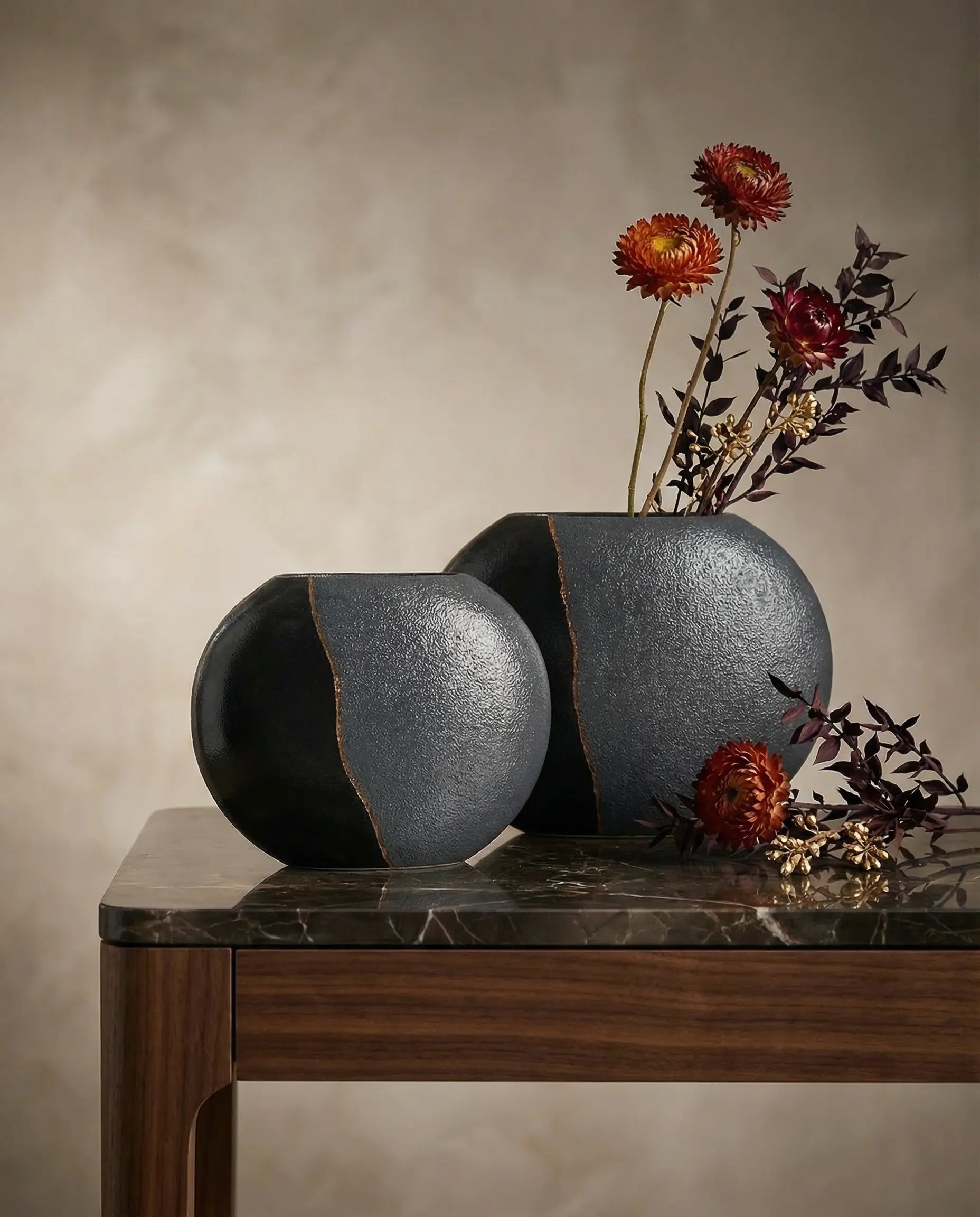 Bakirdan Flaches Keramikvasen-Set (2-teilig) (30 cm) – Handgefertigtes Design-Dekor in Anthrazit, Schwarz und Kupfer