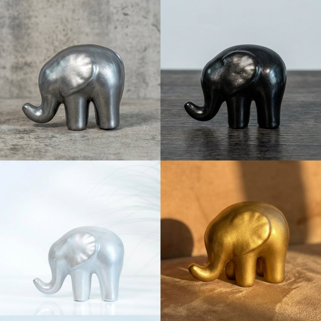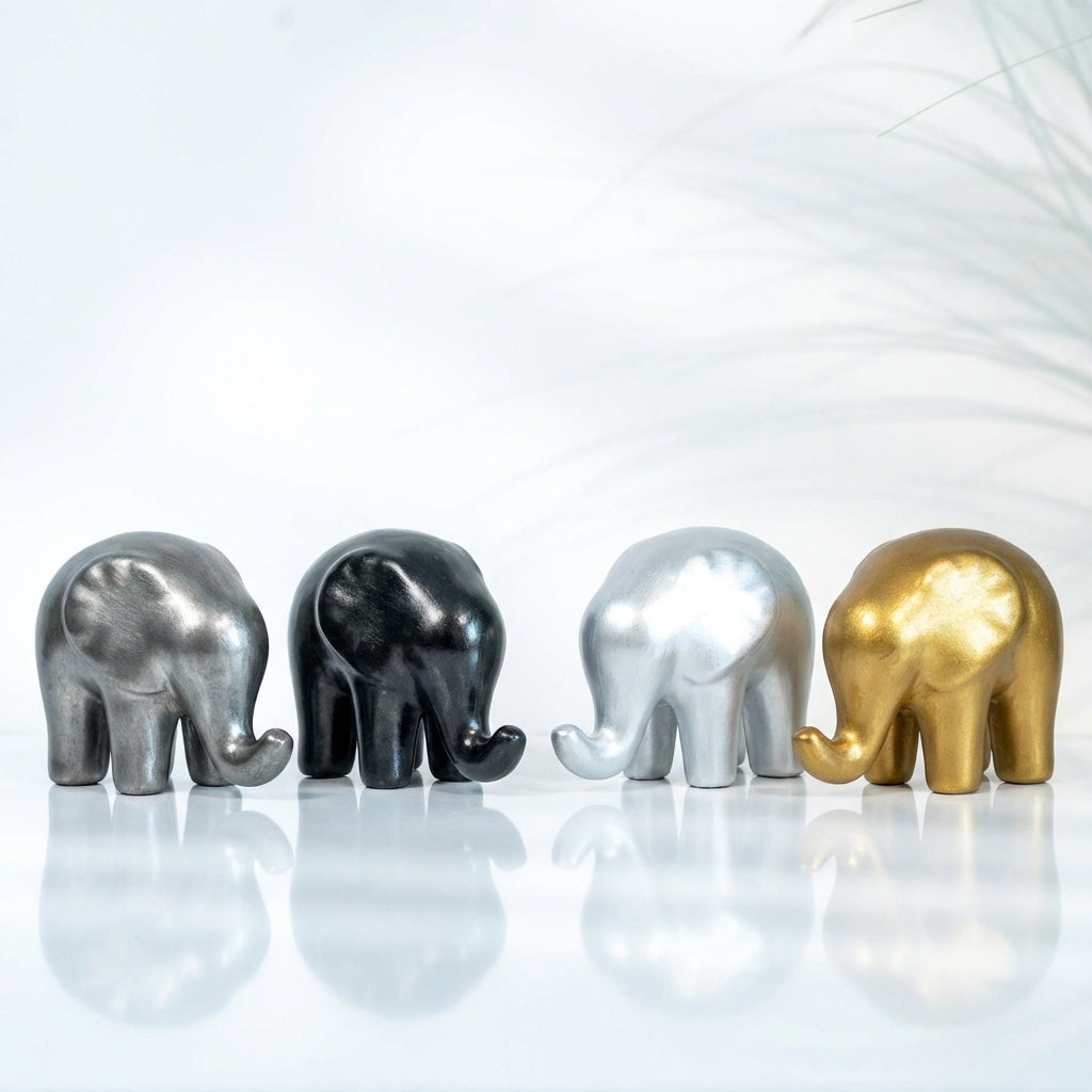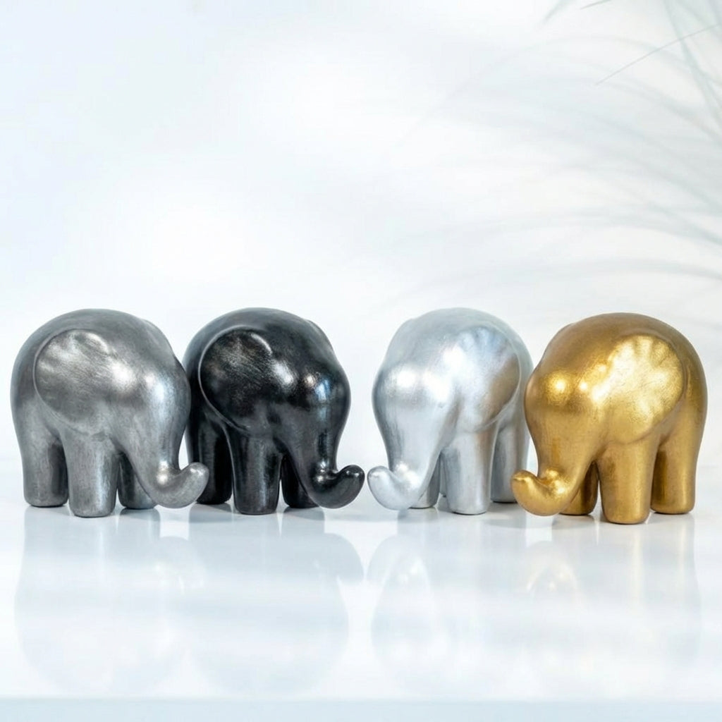 Mini-Glückselefanten-Keramikset (4-teilig) – Handgefertigtes Designer-Dekor in Schwarz, Gold, Silber und Perlmutt (17 cm)