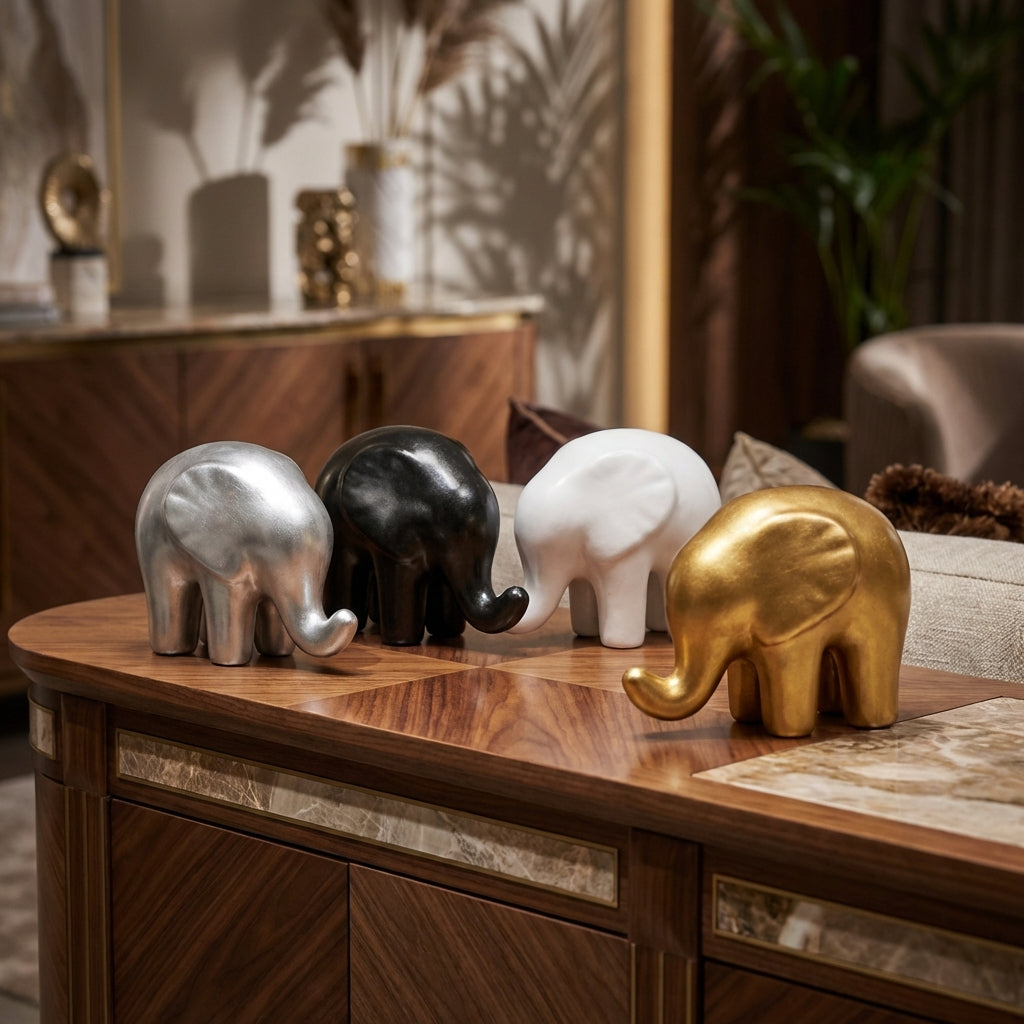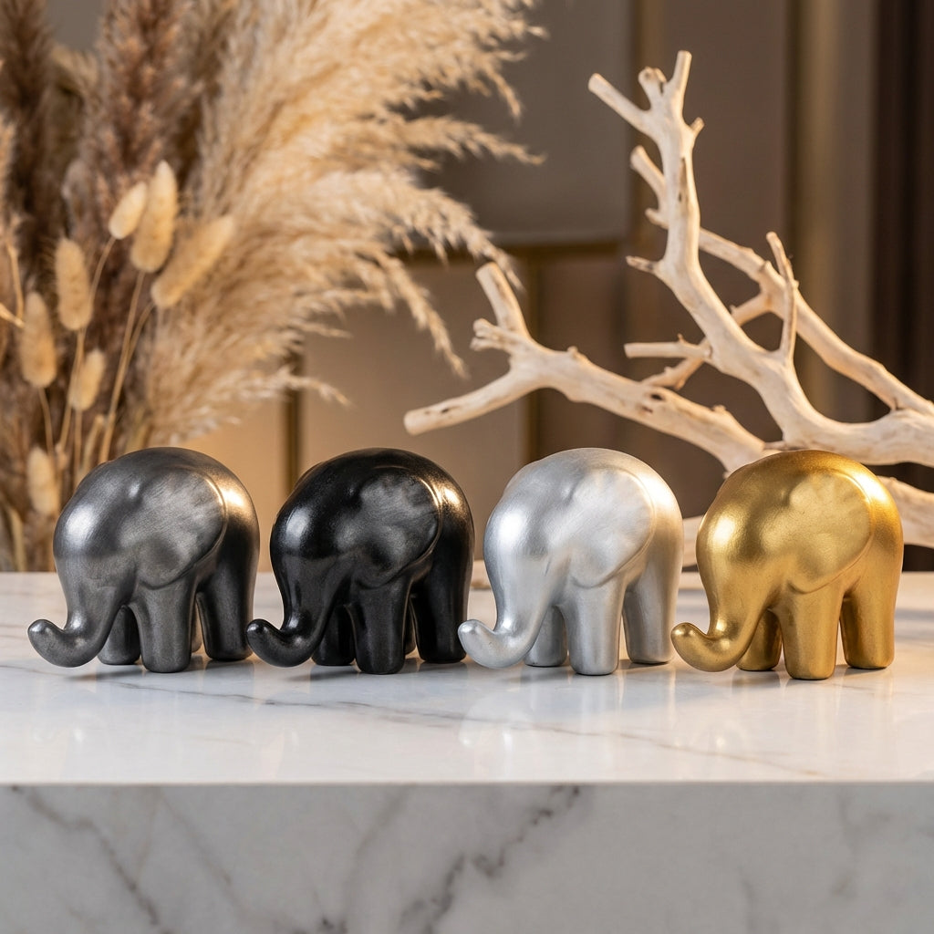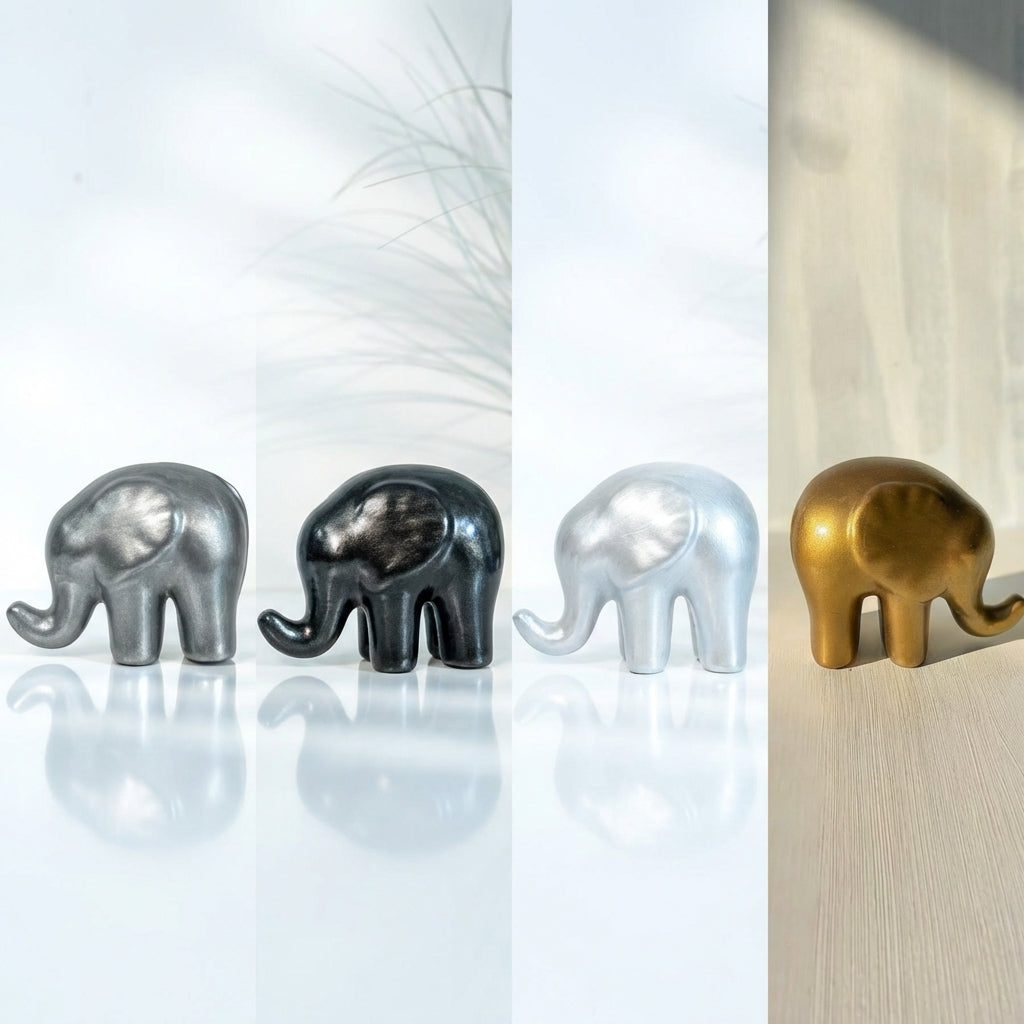 Mini-Glückselefanten-Keramikset (4-teilig) – Handgefertigtes Designer-Dekor in Schwarz, Gold, Silber und Perlmutt (17 cm)